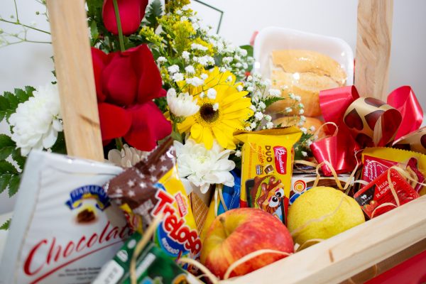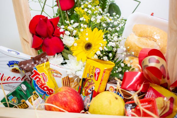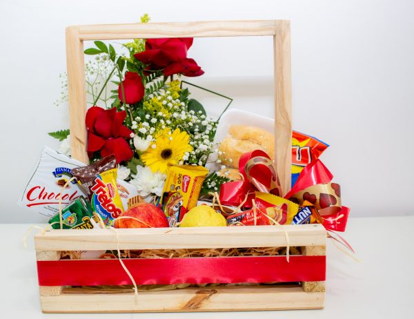 Cesta de café tamanho pequeno com arranjo de flores do campo e rosas.